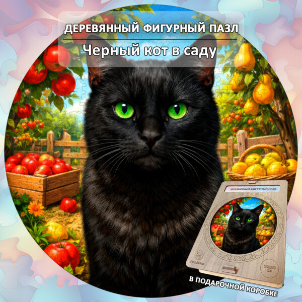 Деревянный пазл Чёрный кот в саду / 30х30см, 200 деталей