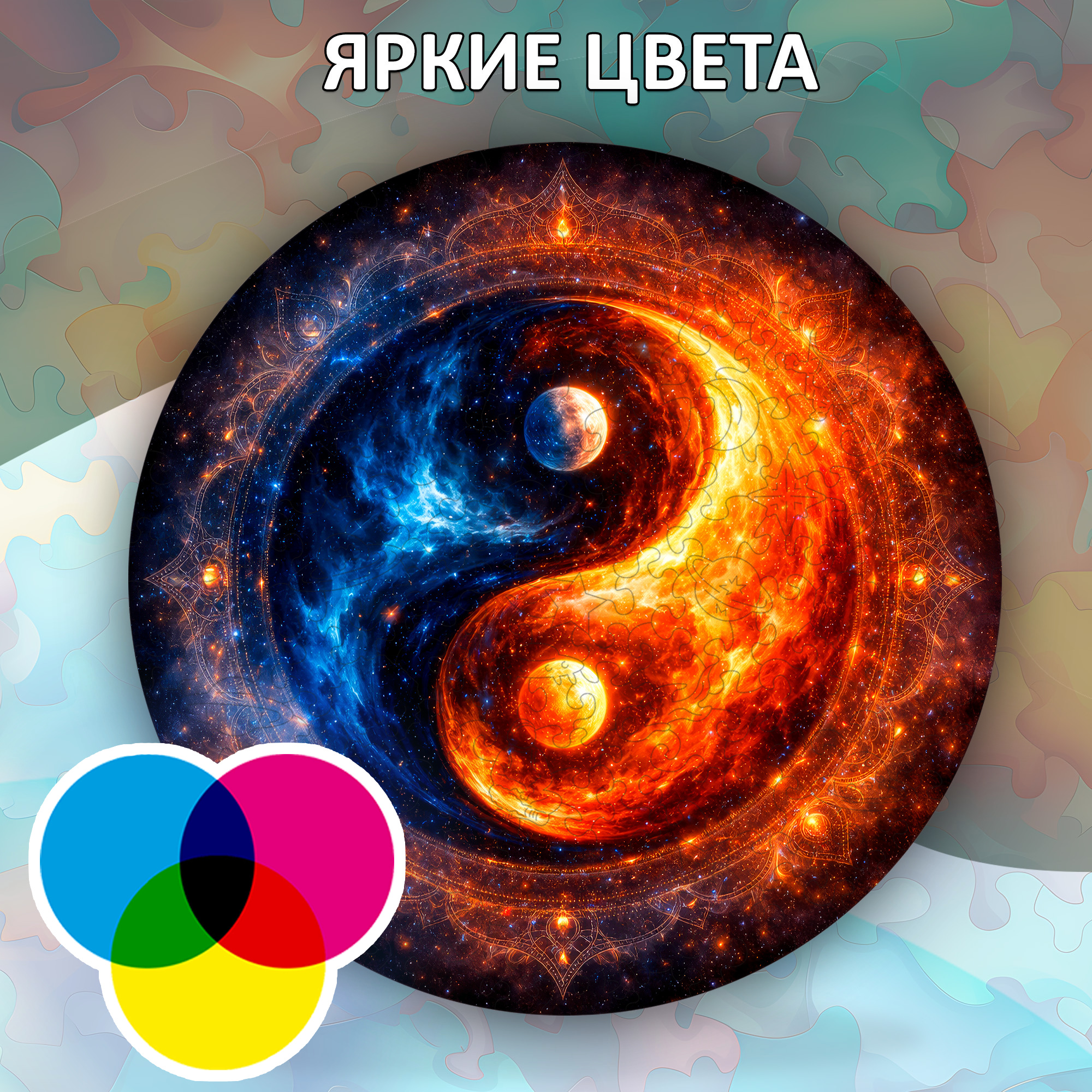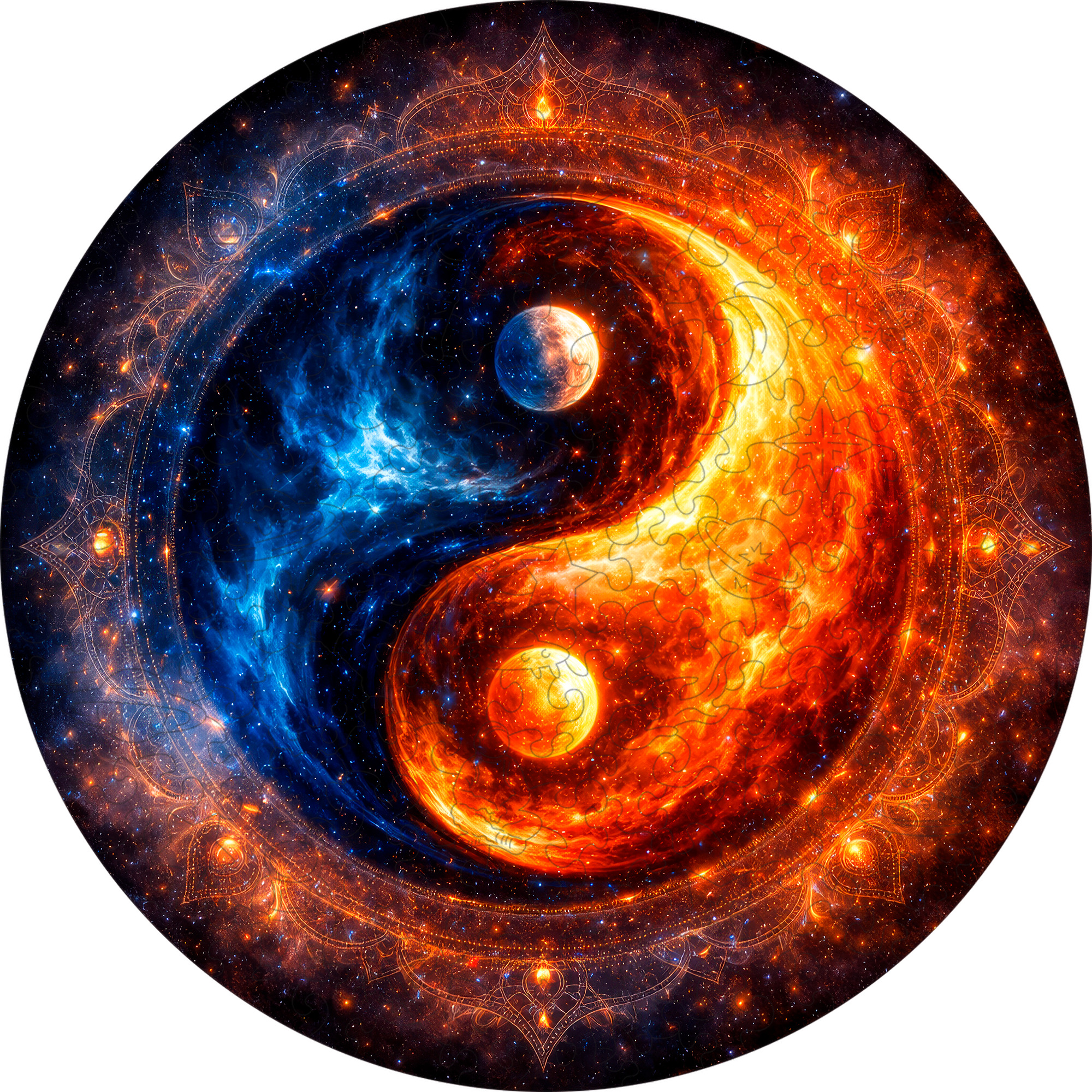 Деревянный пазл «Космическая мандала» — это встреча огня и льда, света и тьмы, движения и покоя. В центре композиции — мощный символ баланса, где космические стихии переплетаются в идеальной гармонии. Глубокий синий и огненно-золотой цвета создают ощущение энергии, словно перед вами не просто изображение, а живая вселенная.