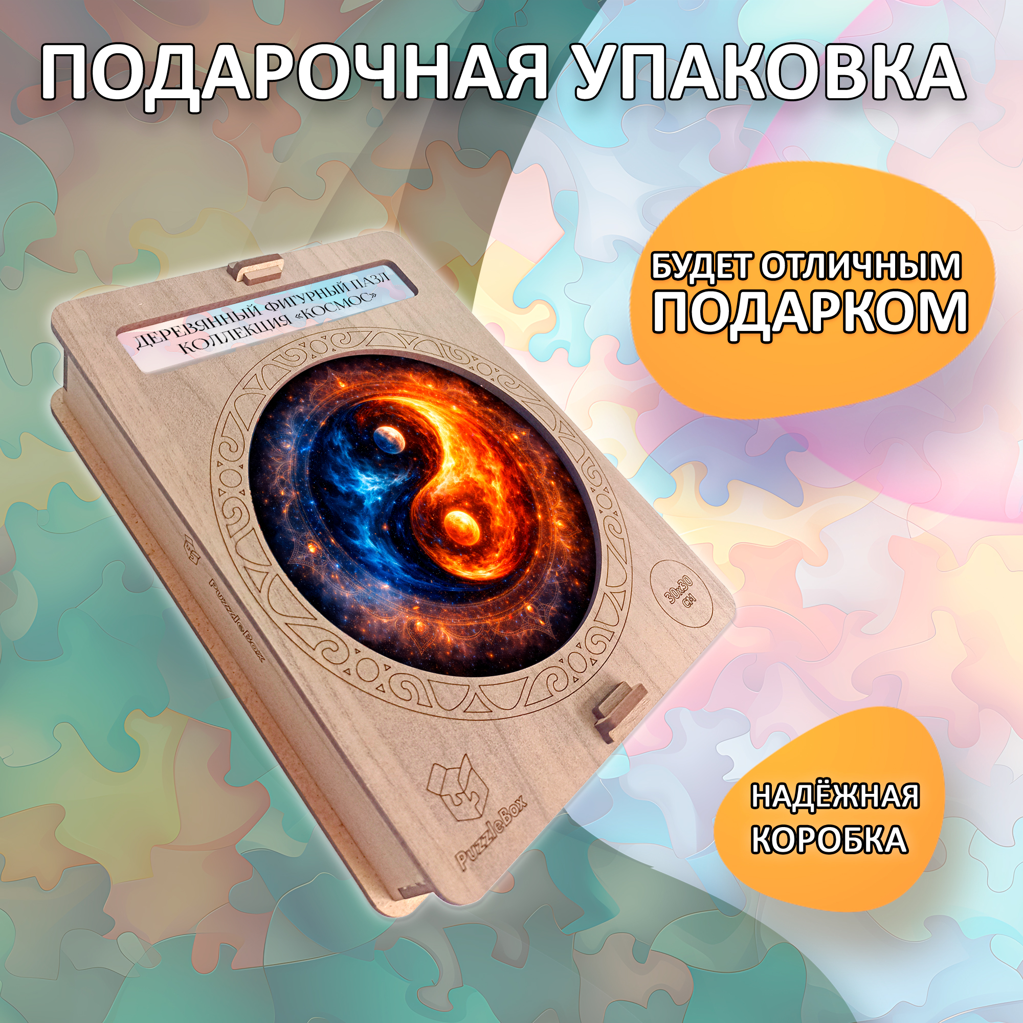 Мы производим деревянные пазлы в России и продаём их напрямую от производителя. Каждый пазл упакован в жёсткую подарочную коробку из ХДФ с надёжными застёжками. Коробка запаяна в термоусадочную плёнку и дополнительно защищена транспортировочной упаковкой. На изделии нет стикеров маркетплейсов — пазл можно смело дарить в аккуратном виде.