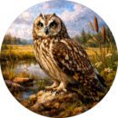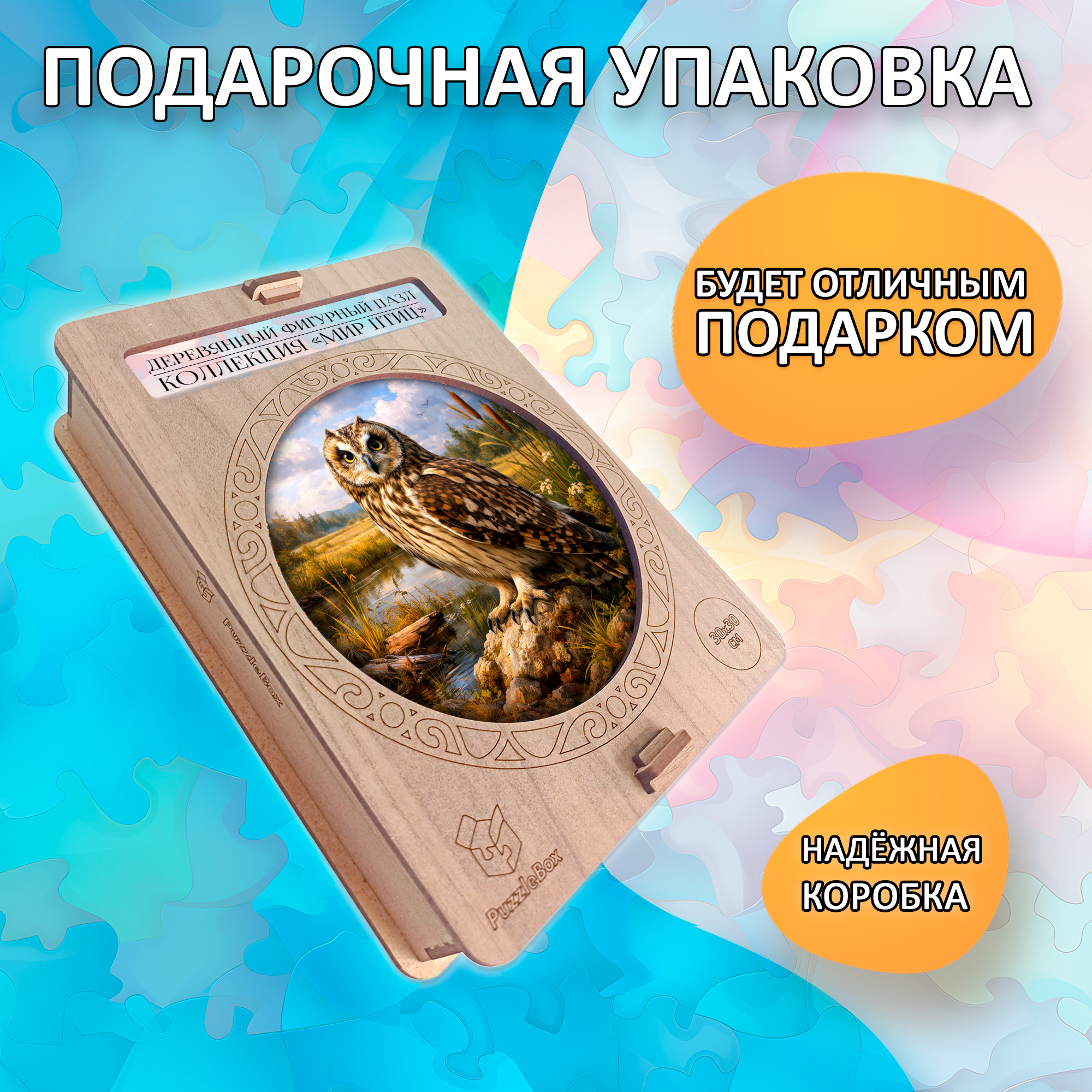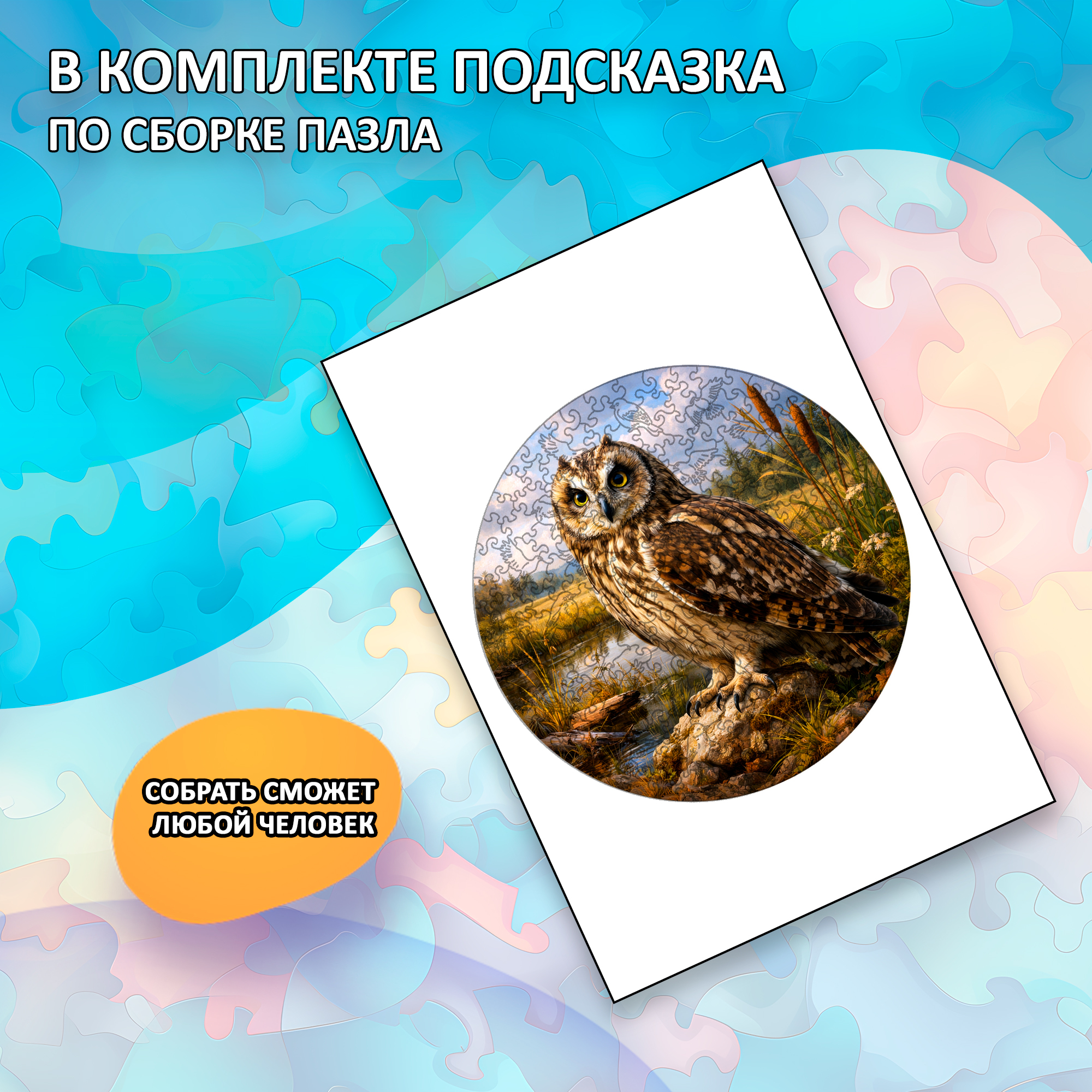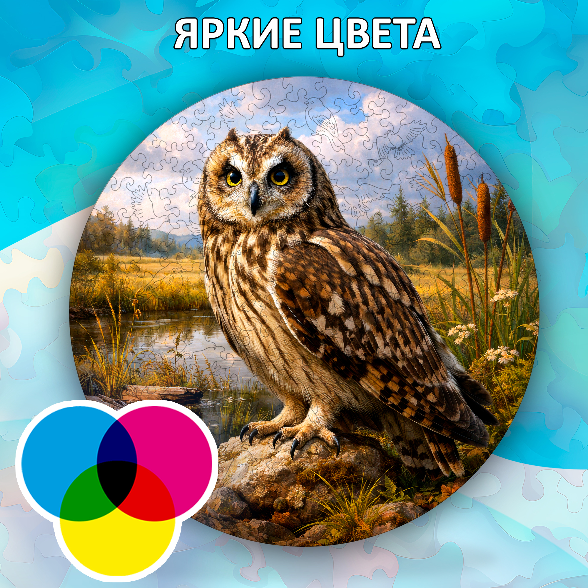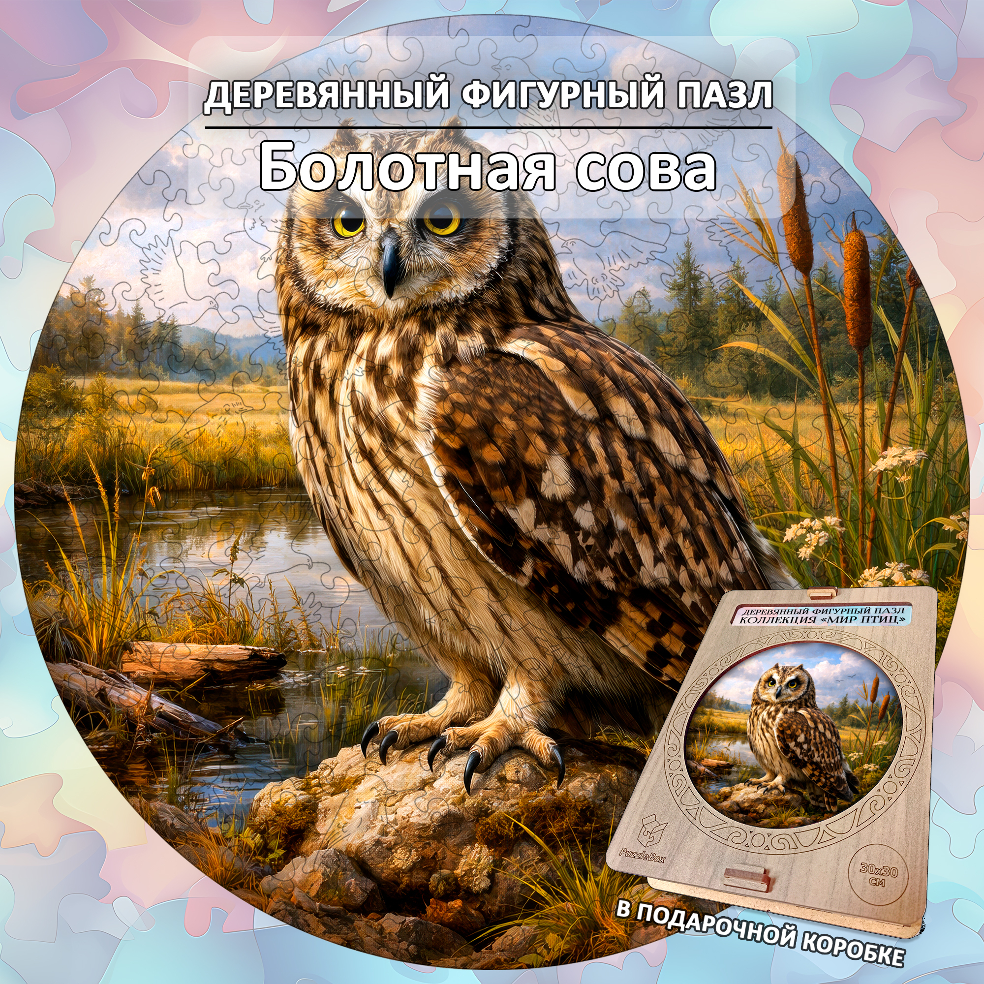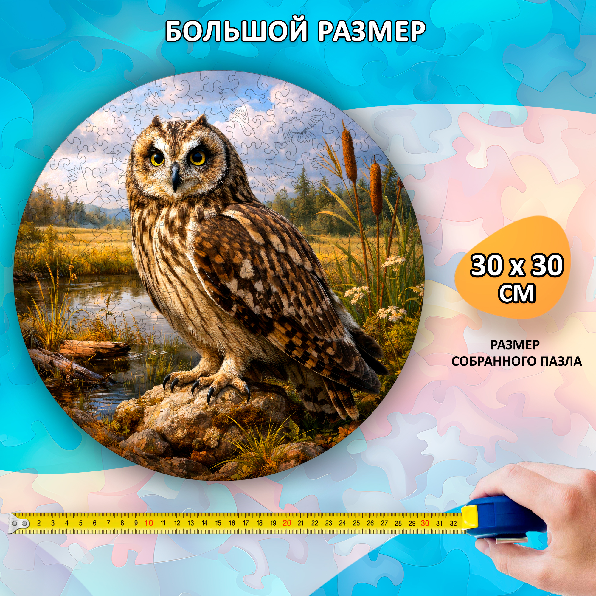 Болотная сова — одна из самых выразительных птиц наших широт. У неё внимательный, почти человеческий взгляд и удивительно тёплый окрас оперения. На этом деревянном пазле сова изображена на фоне тихого водоёма и лугов — сцена выглядит живо и реалистично, словно кадр из документального фильма о дикой природе.