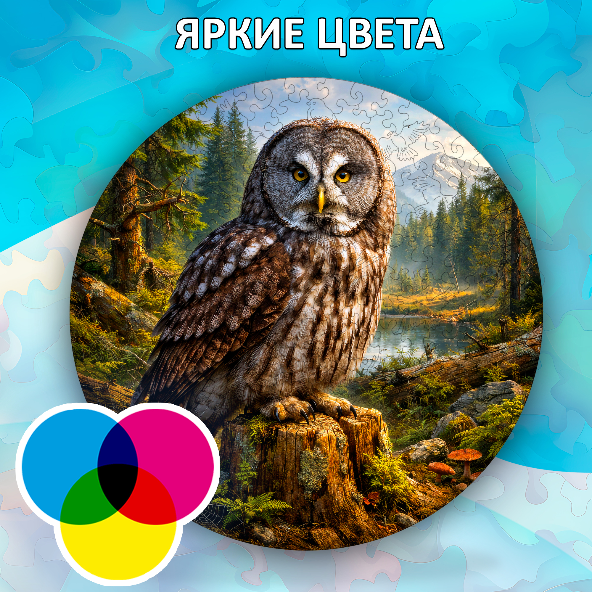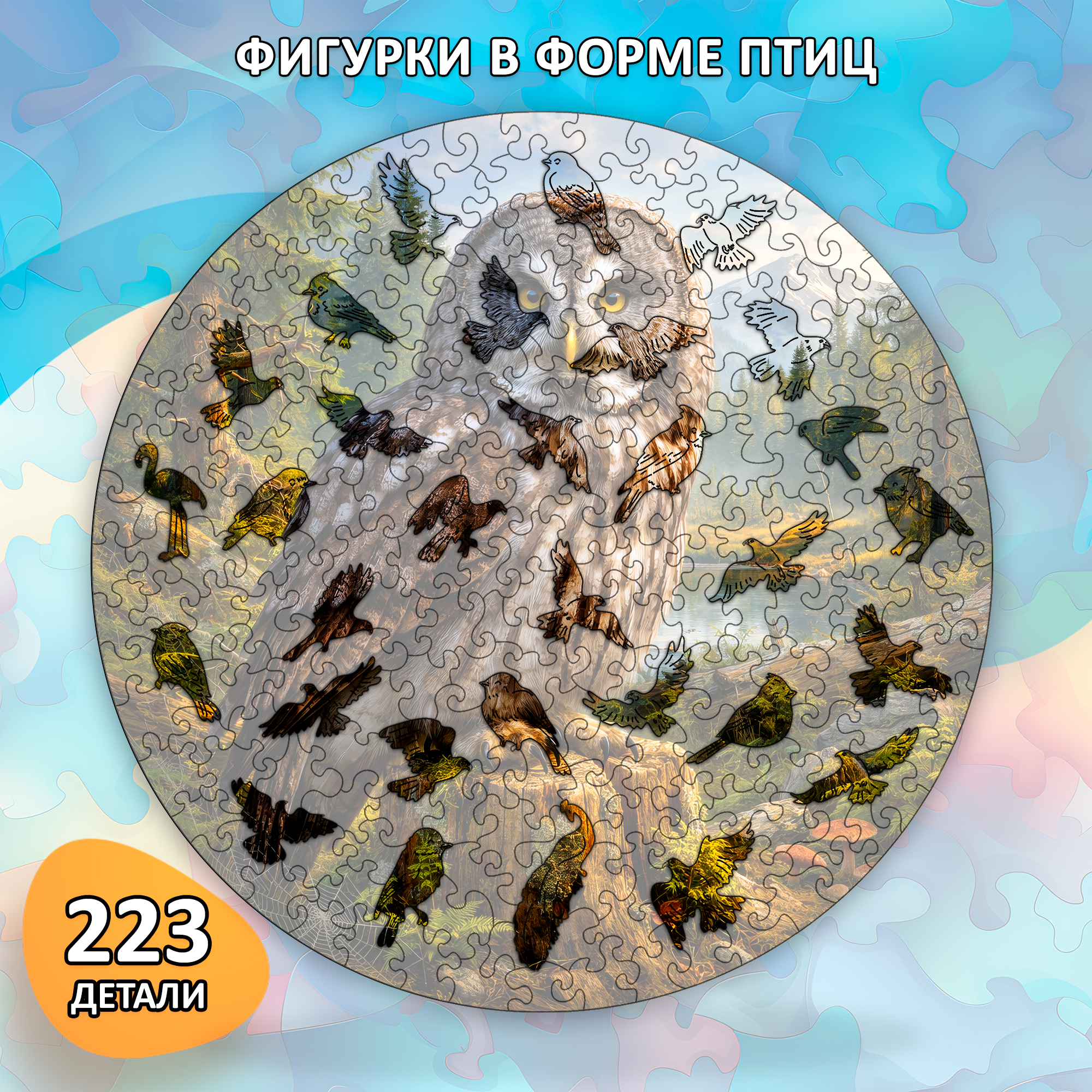 Этот пазл интересно собирать именно как предмет, а не просто как изображение. Сначала в руках появляются отдельные деревянные фрагменты — каждый со своей формой и линией. Потом постепенно выстраивается фон: камни, вода, деревья. И только в самом конце проявляется бородатая неясыть с её внимательным взглядом и характерным «капюшоном» из перьев. В этот момент картинка словно собирается в единое целое — и это ощущается почти физически.