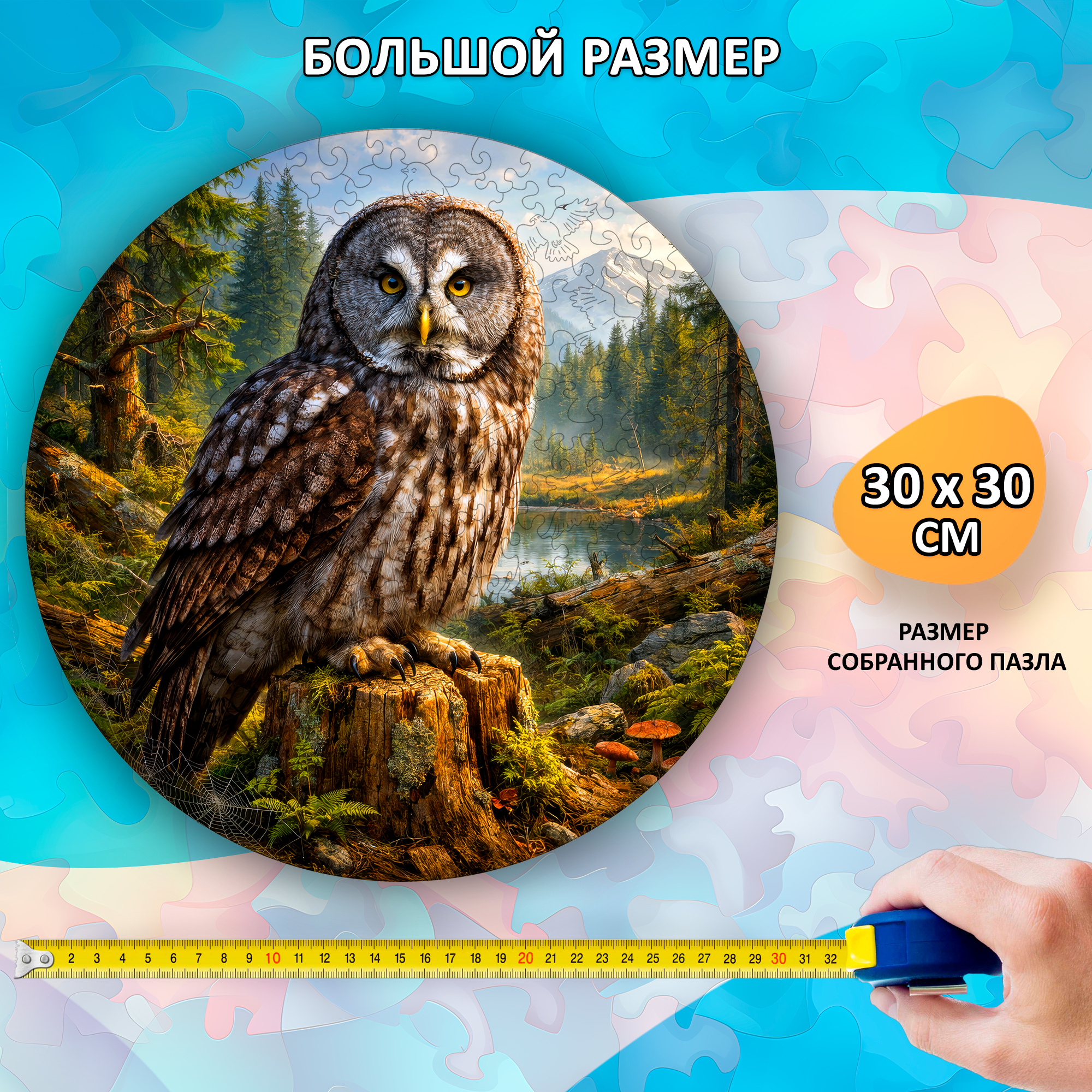 Деревянный пазл с бородатой неясытью выбирают те, кто ценит нестандартные вещи и любит ощущение «живого» процесса. Его покупают детям и взрослым, для спокойной сборки дома или в подарок человеку, которому хочется подарить не просто предмет, а занятие. После сборки получается выразительная круглая картина, которую приятно оставить на виду.