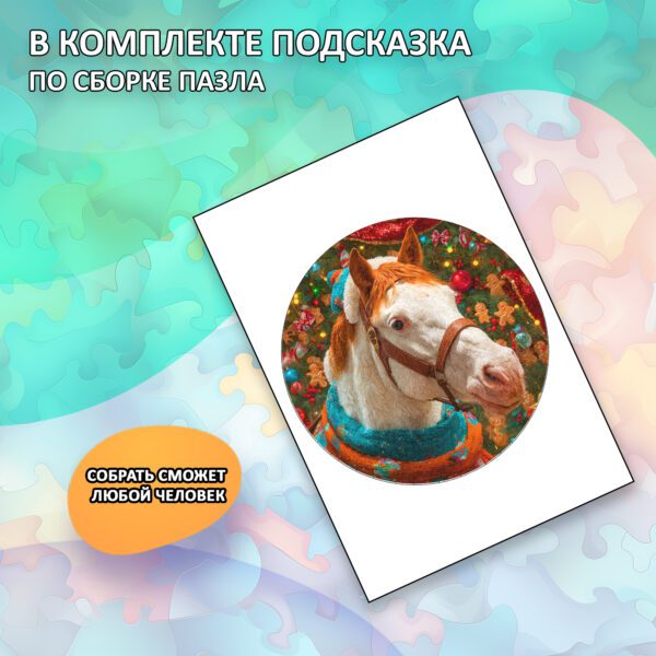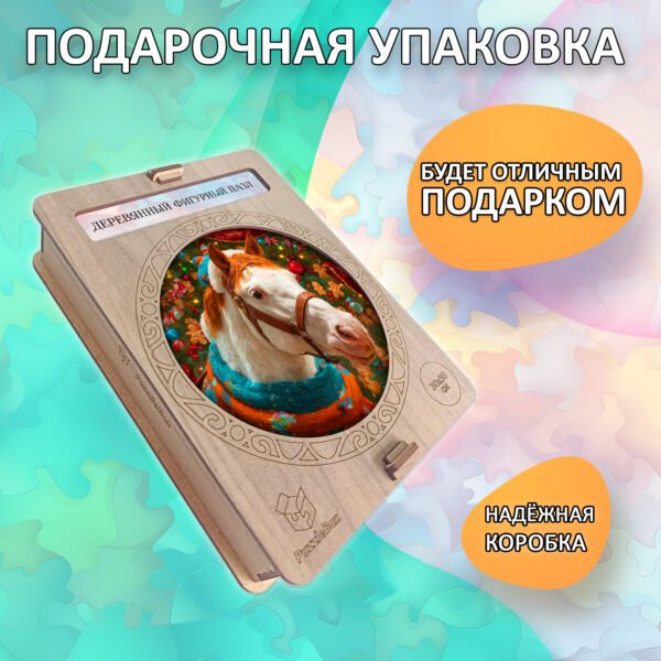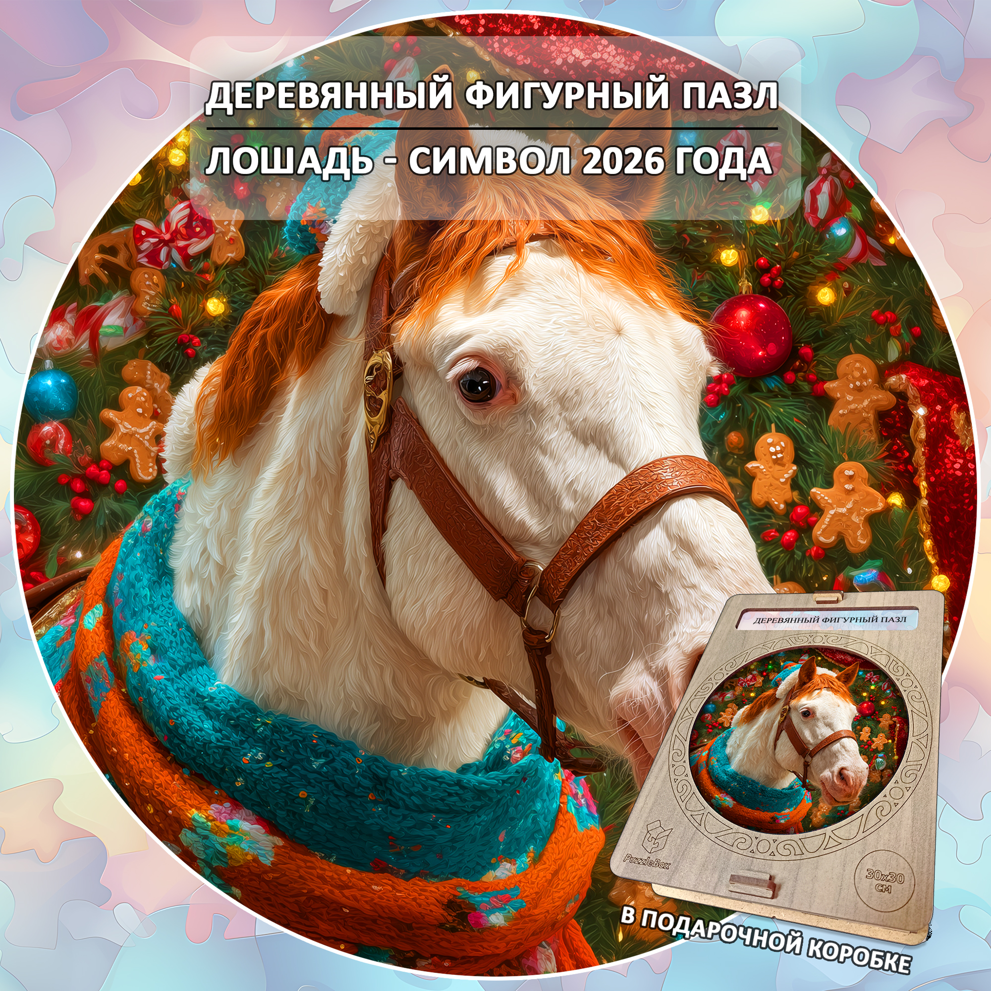 Купить деревянный пазл с символом 2026 года — лошадью. Подарочный набор с новогодней тематикой и подсказкой для лёгкой сборки.