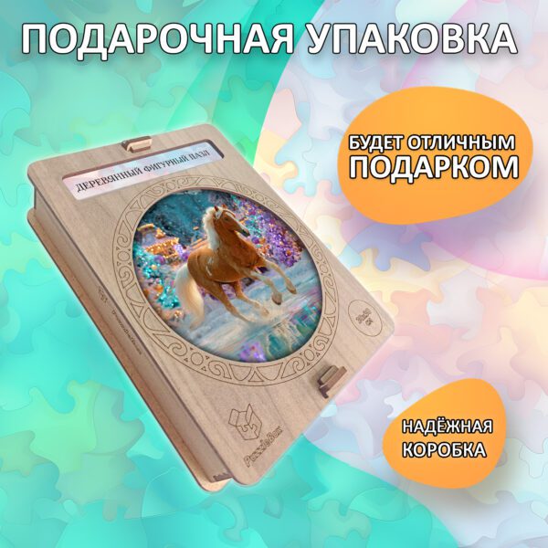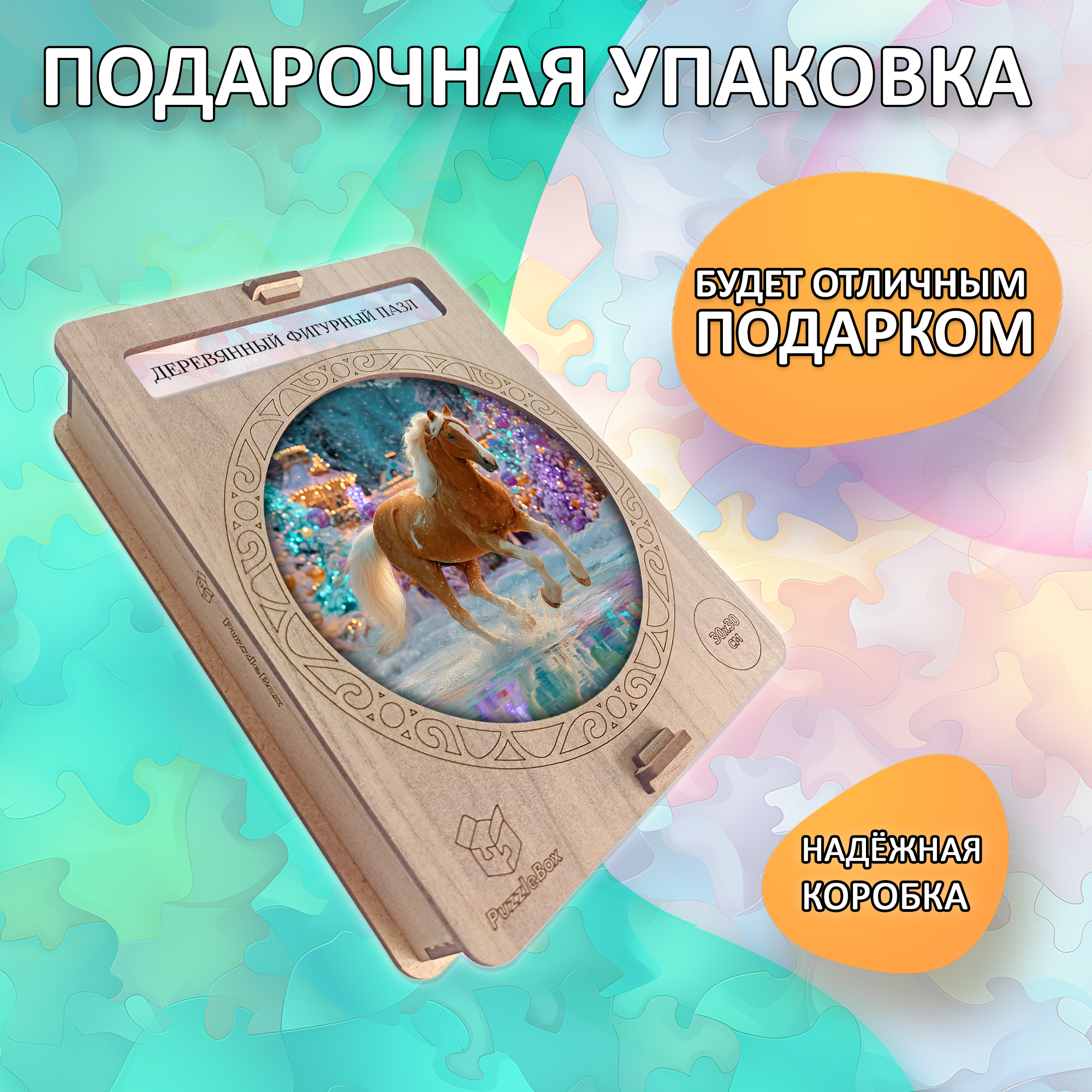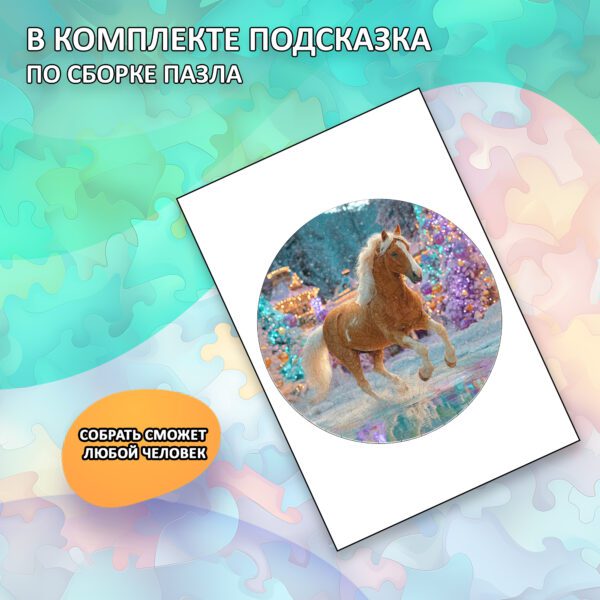 Купить деревянный пазл с символом 2026 года — лошадью. Подарочный набор с новогодней тематикой и подсказкой для лёгкой сборки.