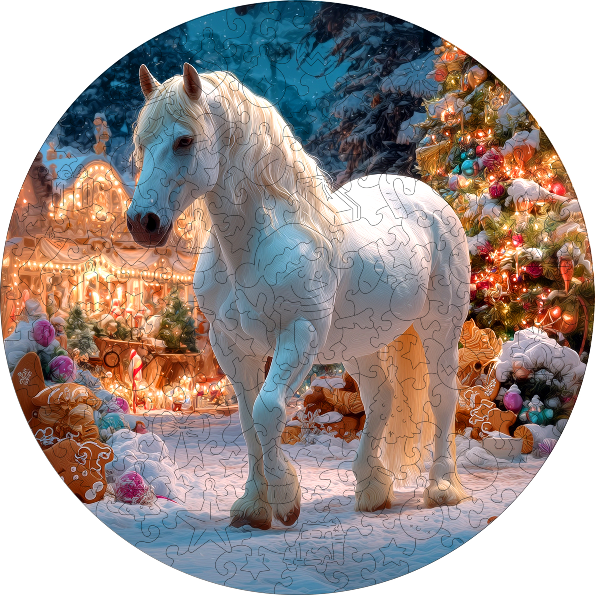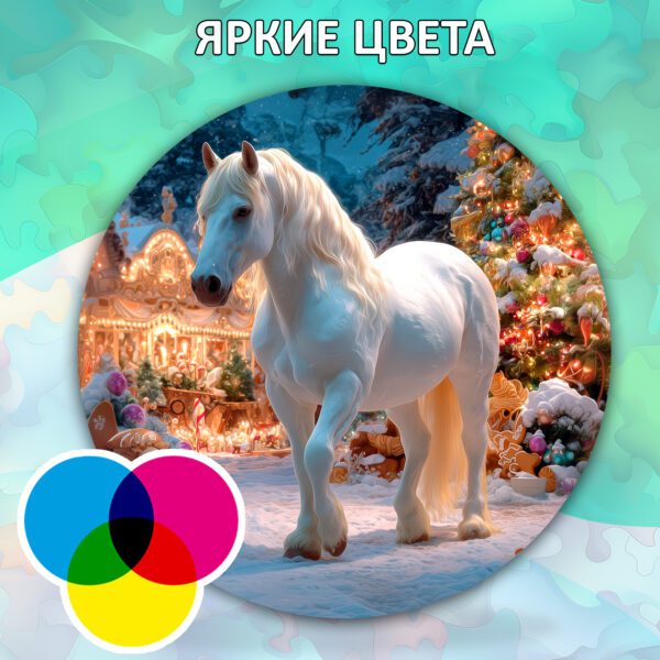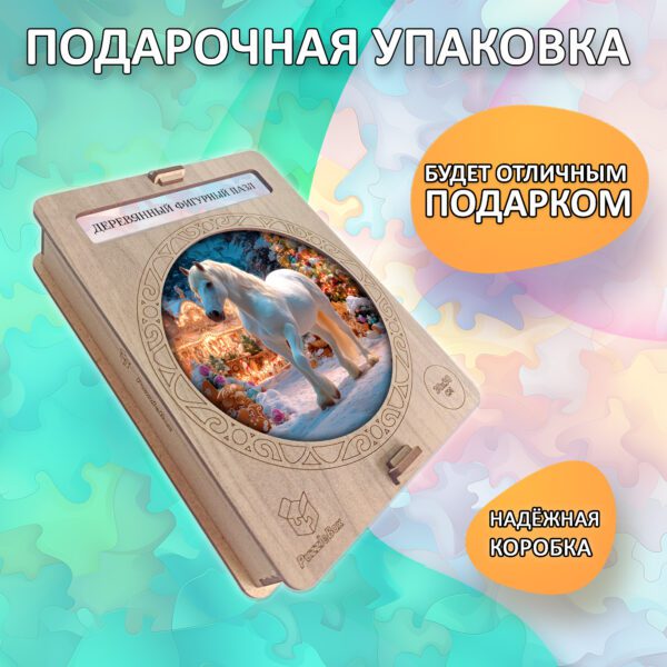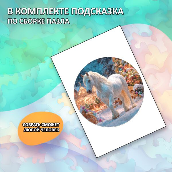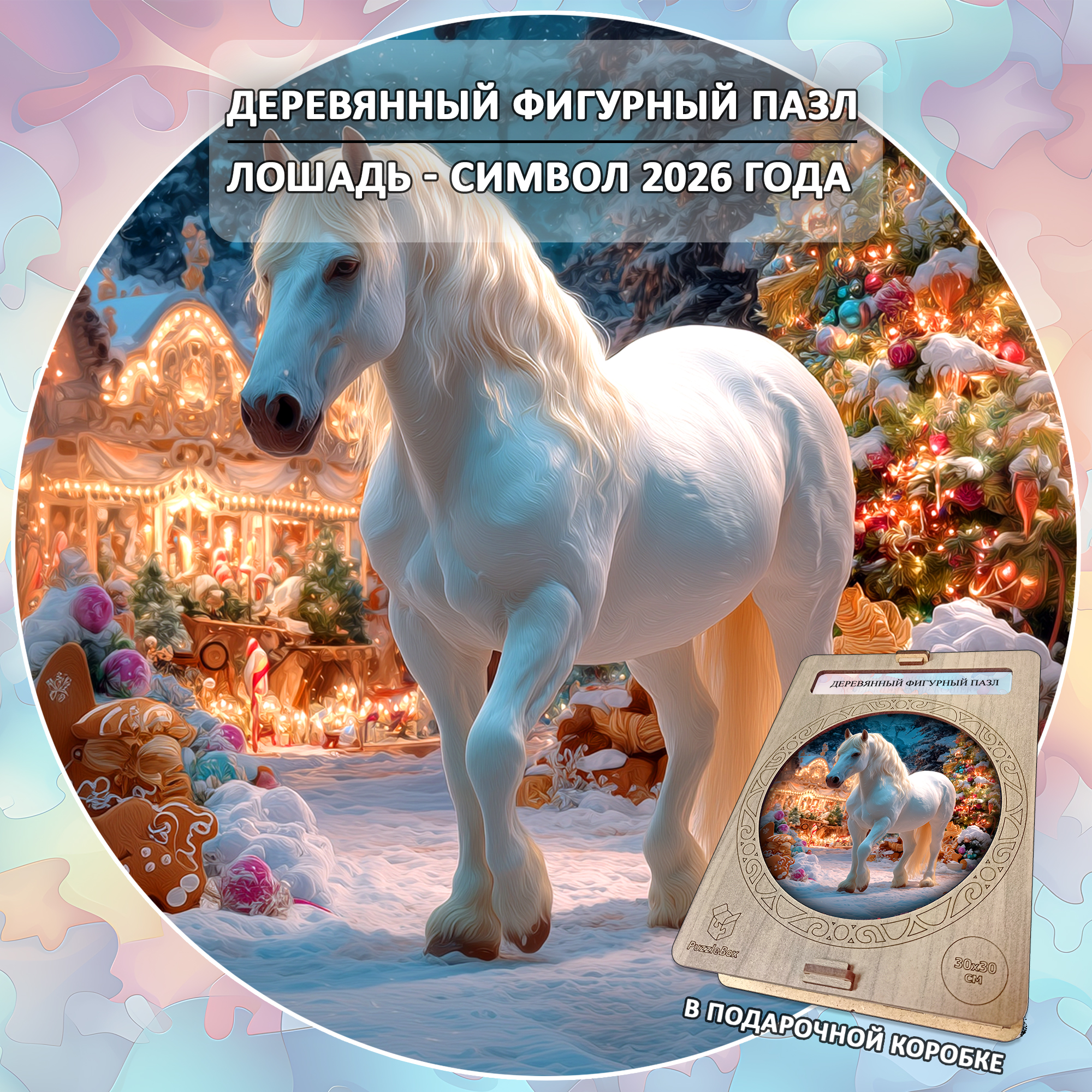 Купить деревянный пазл с символом 2026 года — лошадью. Подарочный набор с новогодней тематикой и подсказкой для лёгкой сборки.
