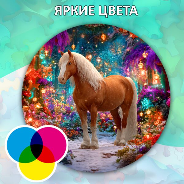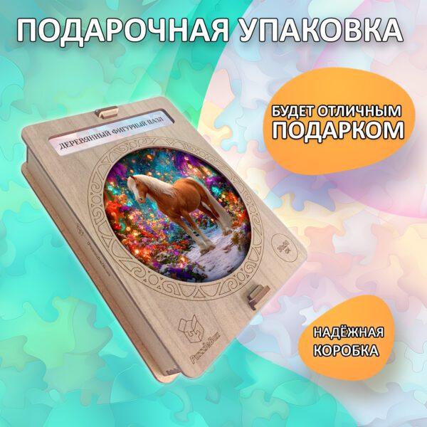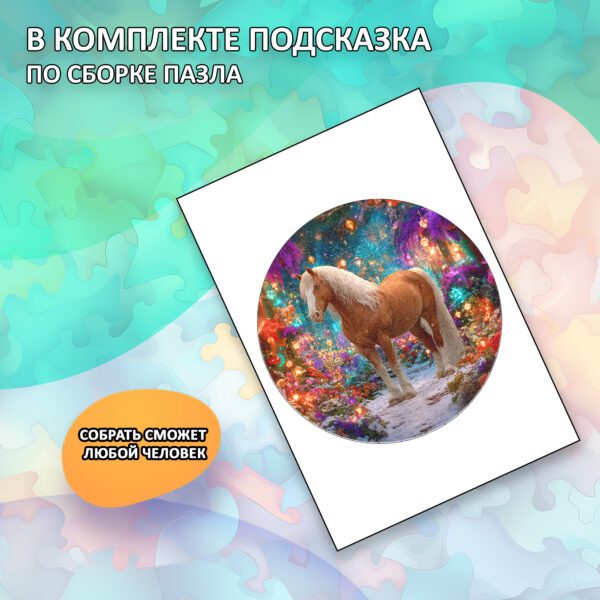 Купить деревянный пазл с символом 2026 года — лошадью. Подарочный набор с новогодней тематикой и подсказкой для лёгкой сборки.
